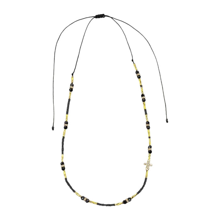 Collar ajustable con cuentas de vidrio negras y doradas, acentuado con cruz dorada y terminales tipo tubo. Largo ajustable hasta 24 pulgadas.