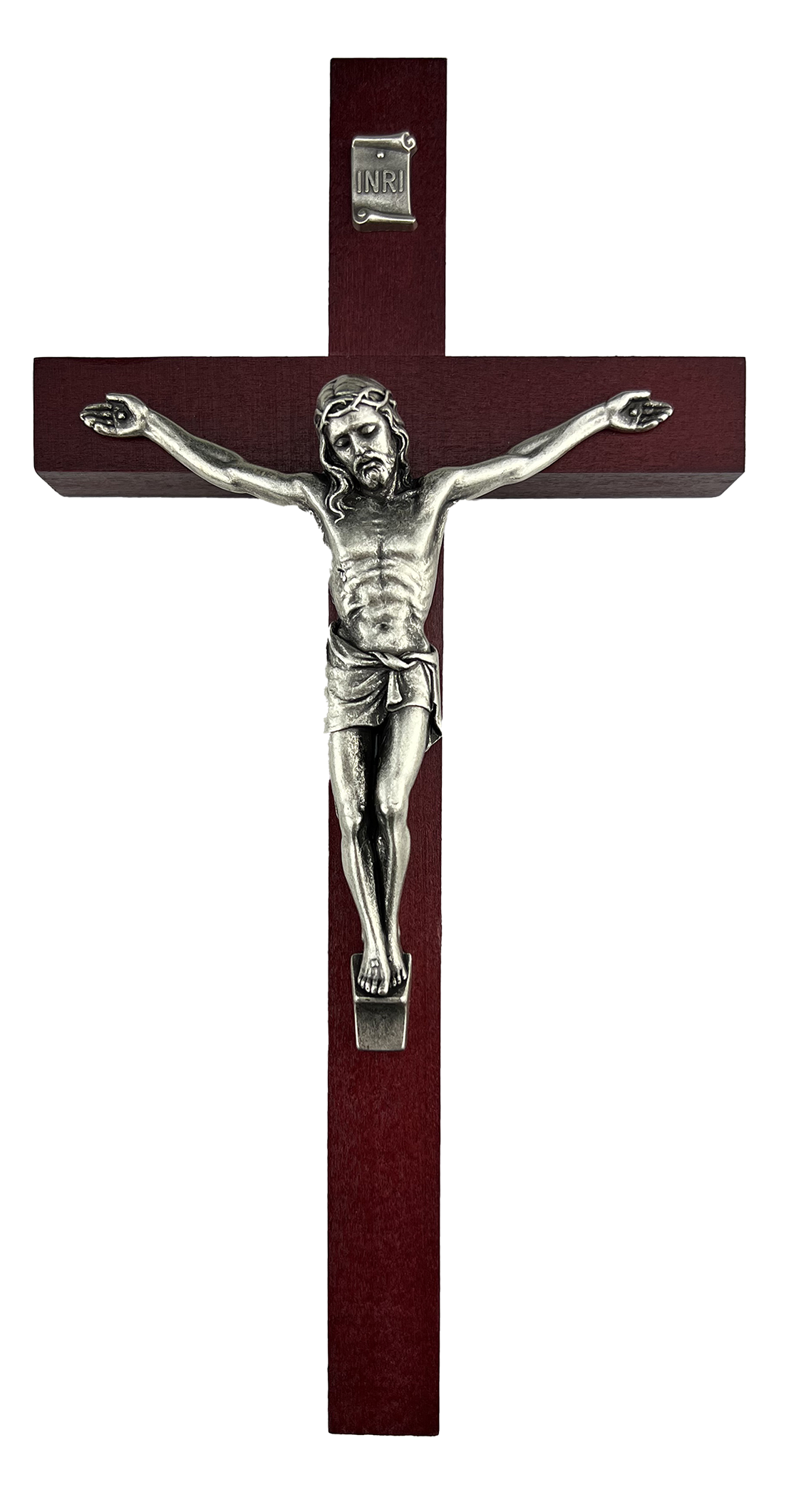 Crucifijo de 10 pulgadas en madera con acabado tono cerezo, con corpus plateado de 4¾ pulgadas. El corpus está elaborado en zinc Crucifijo de 10 pulgadas en madera con acabado tono cerezo, con corpus plateado de 4¾ pulgadas. El corpus está elaborado en zinc