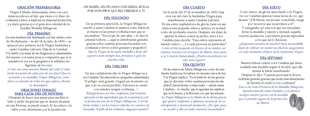 Folleto con los nueve días completos de la Novena a la Virgen de la Medalla Milagrosa