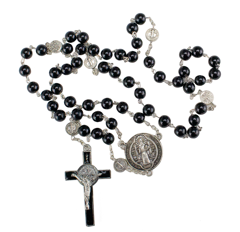 Un rosario sólido y significativo, elaborado con cuentas de vidrio negro de 8 mm y cuentas del Padrenuestro de 10 mm. Cada sección incluye la poderosa medalla de san Benito, finamente grabada, y un centro detallado que resalta su protección contra todo mal. Mide 22 y es ideal para quienes buscan una herramienta de oración fuerte, clásica y llena de fe.