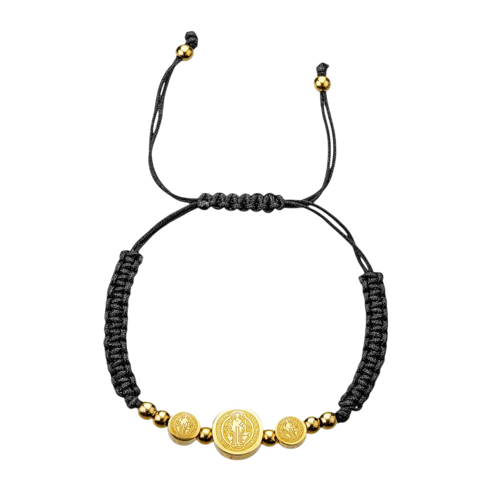 Pulsera de cordón negro de triple hebra, adornada con tres medallas de San Benito de acero inoxidable chapado en oro de 18 quilates. Un diseño duradero y discreto. Se presenta sujeta a una tarjeta y es ajustable hasta un diámetro de 3 1/2 pulgadas.